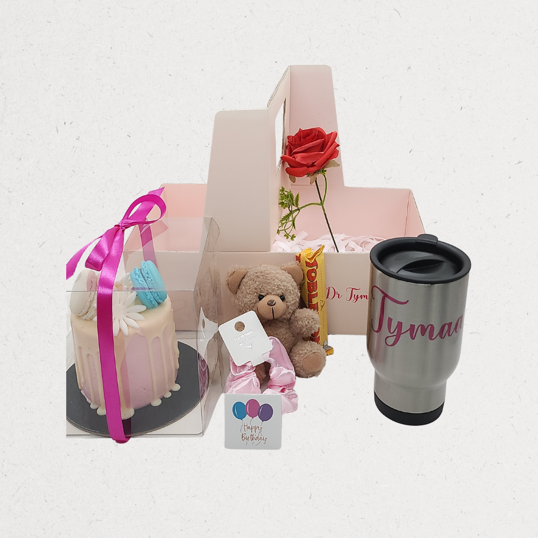 صندوق حضن وكيك يتضمن كوب حراري مُخصص ، دب صغير، زهرة صناعية، ربطة شعر، شوكولاتة، وقالب كيك صغير - مزيجٌ رائع من الحلاوة والجمال. مثالي لأعياد الميلاد، والذكرى السنوية، وحفلات الزفاف، أو لحظات العناية بالنفس .