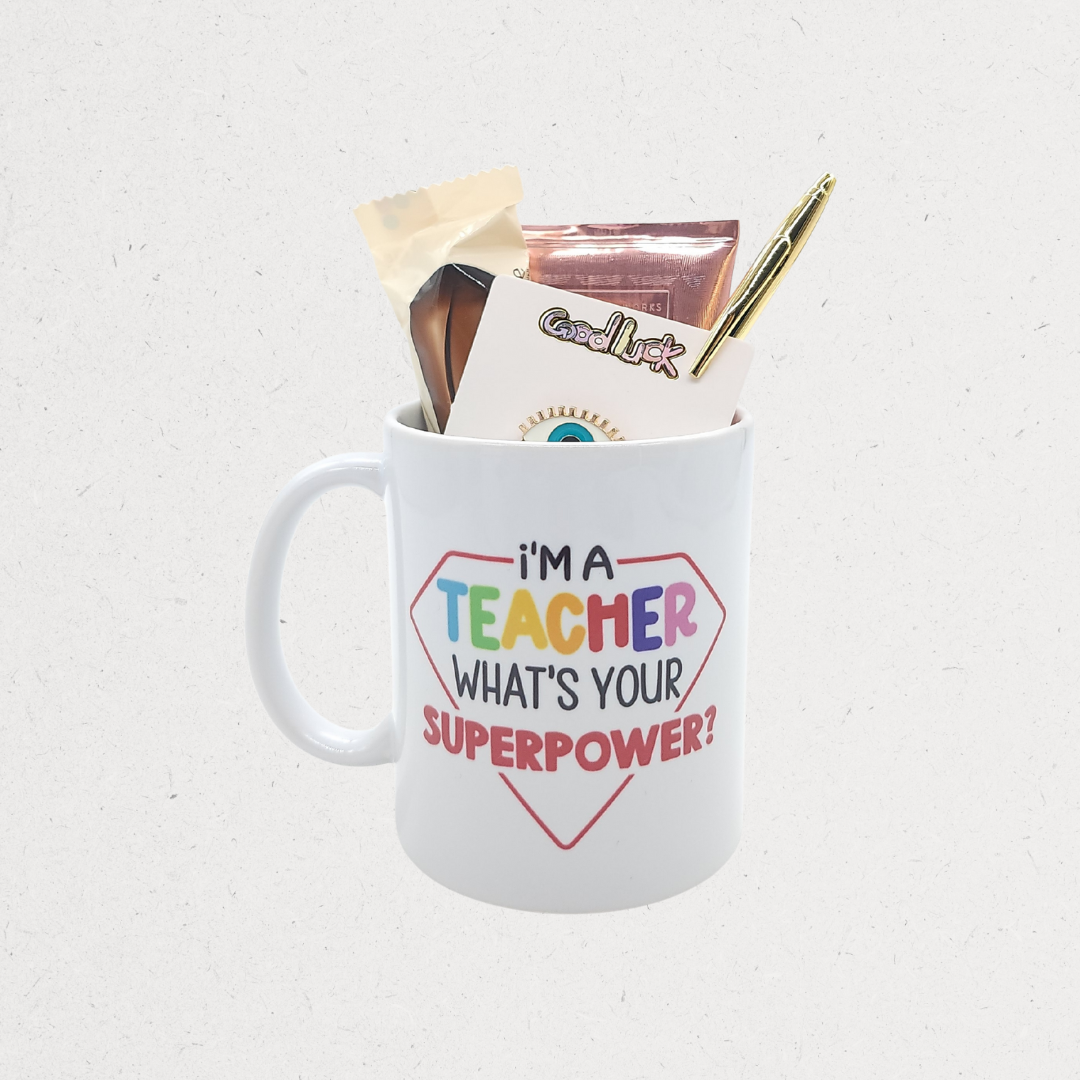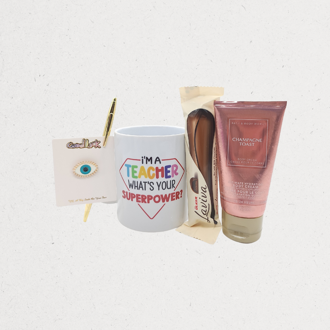 A refined teacher appreciation set featuring a personalized mug, nourishing body cream, protective evil eye brooch, golden pen, and premium chocolate—elegantly packaged and card-ready.